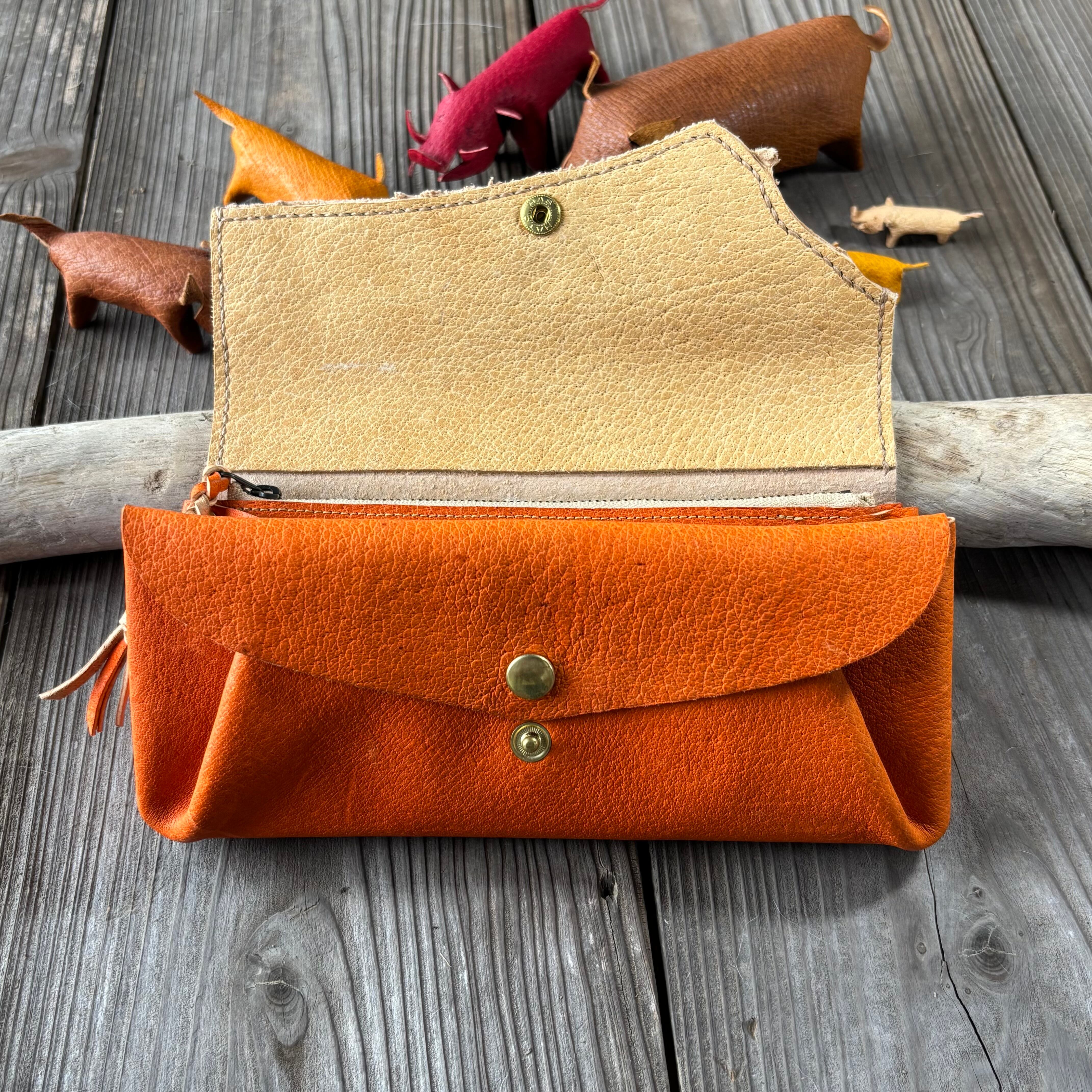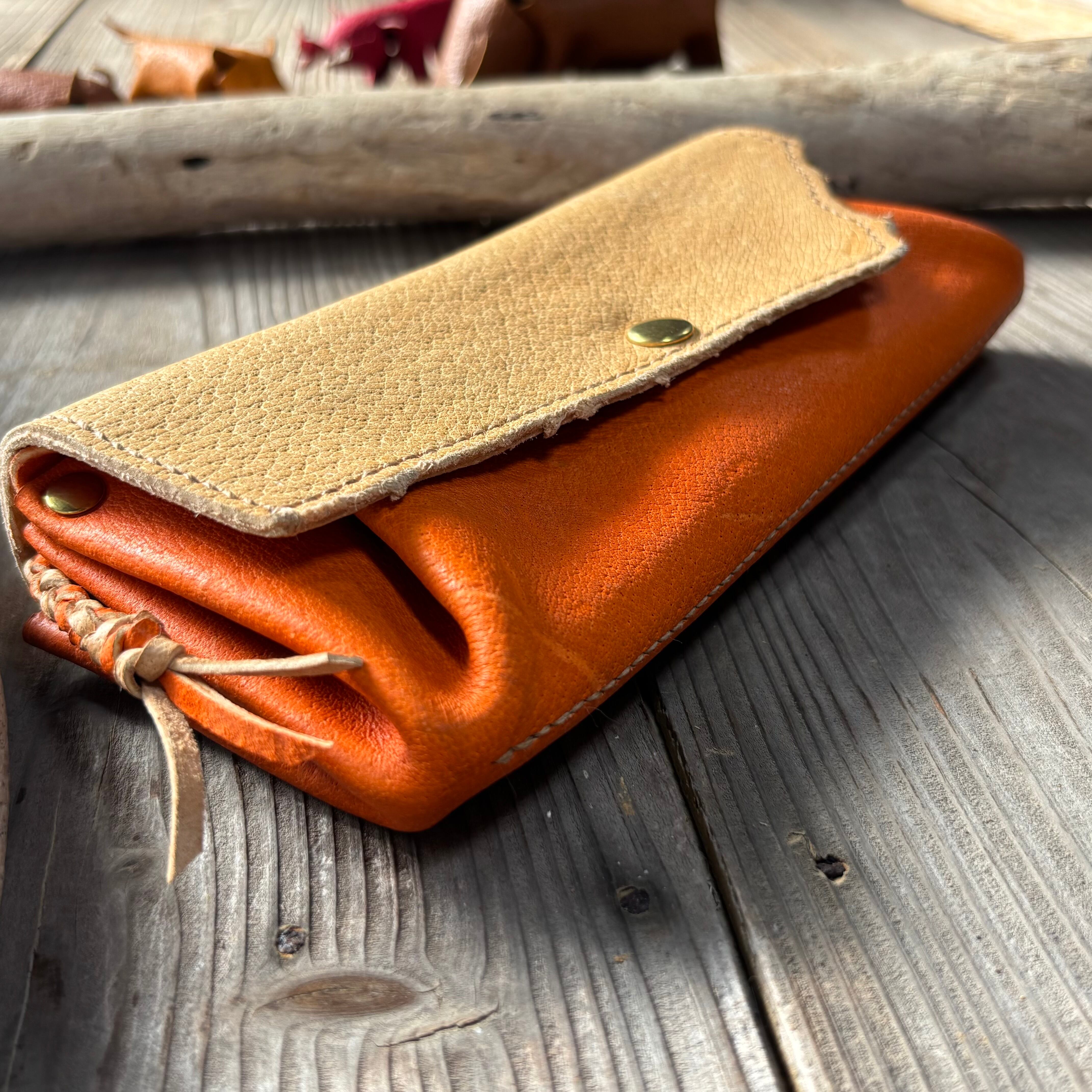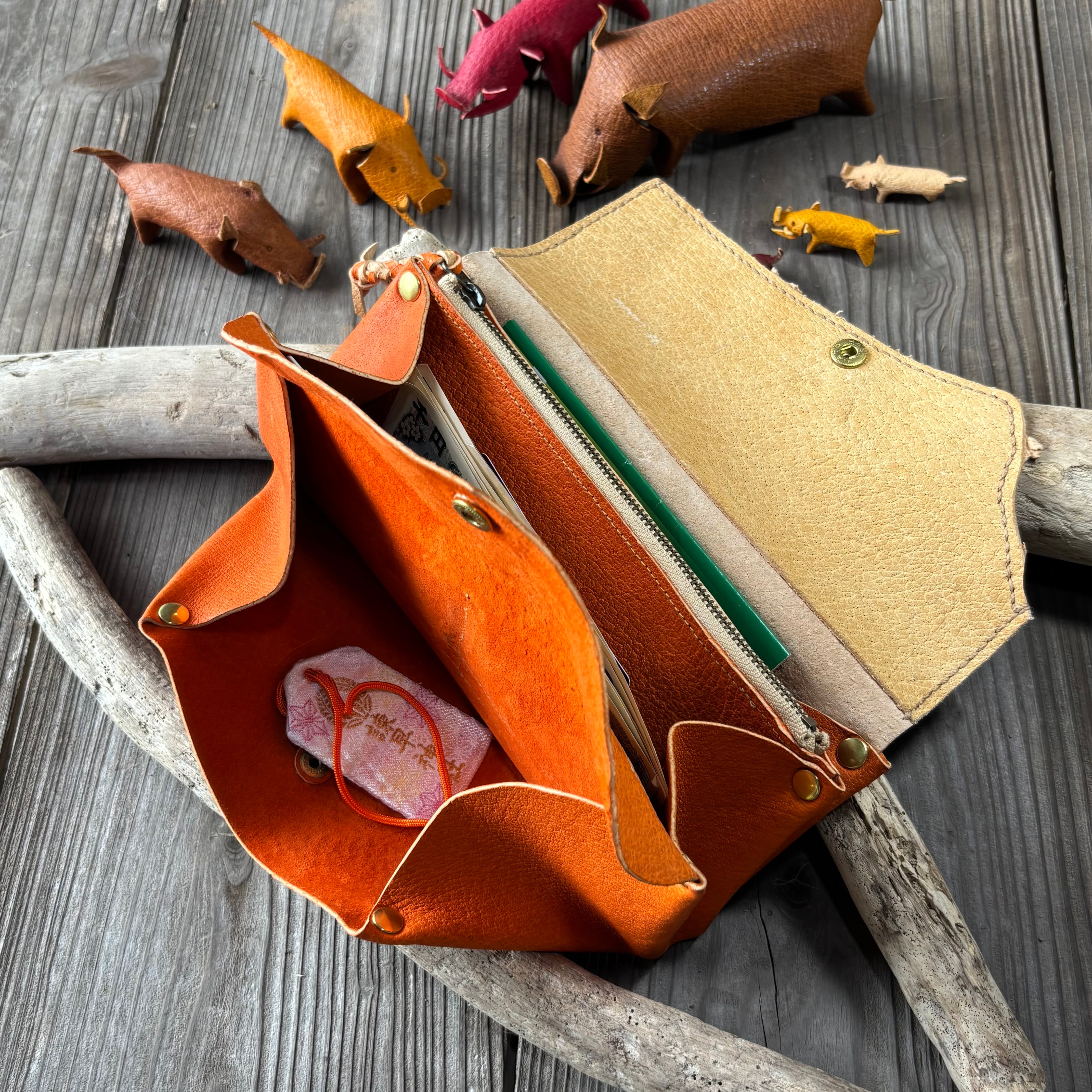 本体を1枚のレザーで包み込んだ、丸みのある柔らかなカタチの長財布です