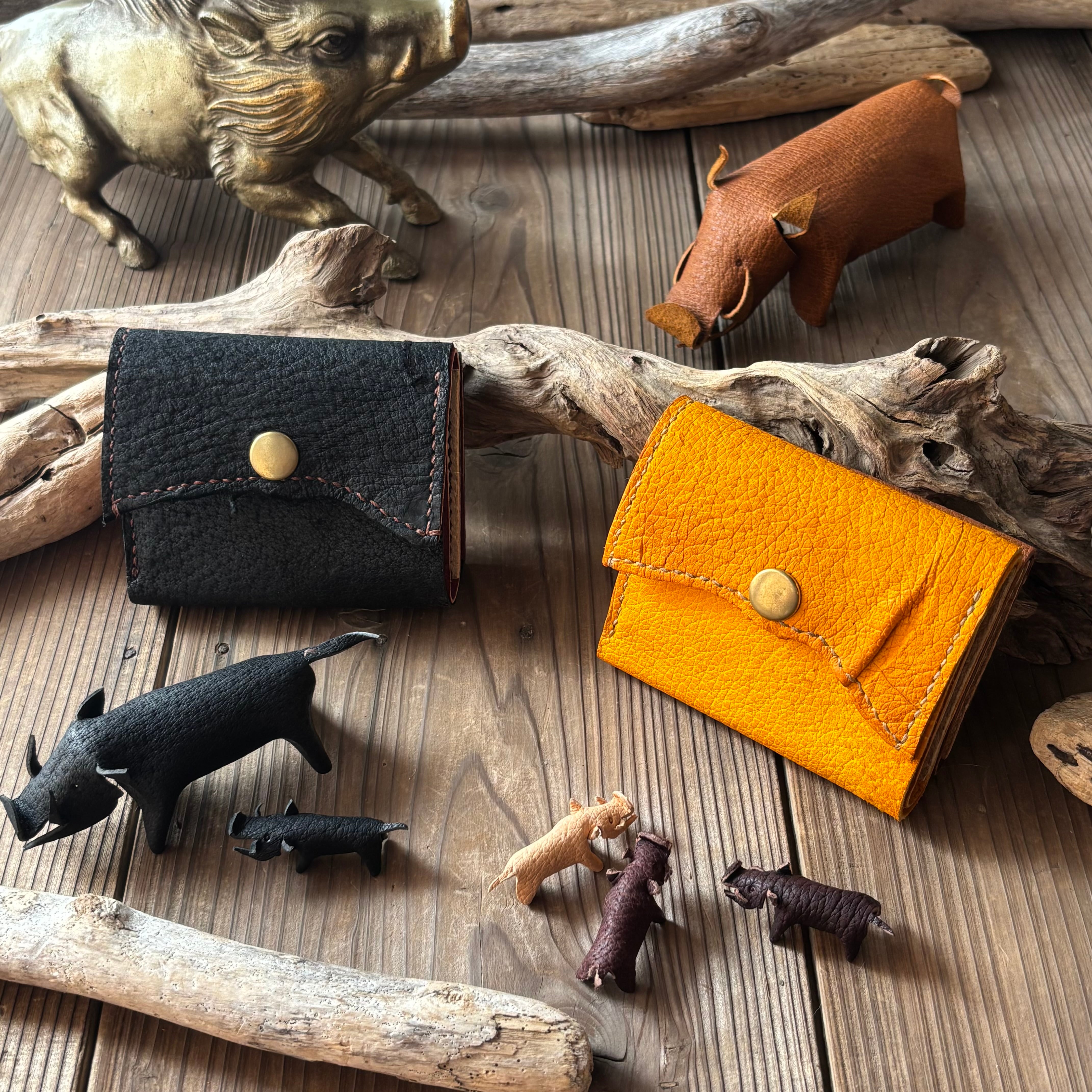 These pieces were made from wild boar leather sourced from animals culled in Isahaya City, Nagasaki Prefecture, and transformed from fur into leather in the atelier of Gibier Boar Leather HUMMINGBIRD.