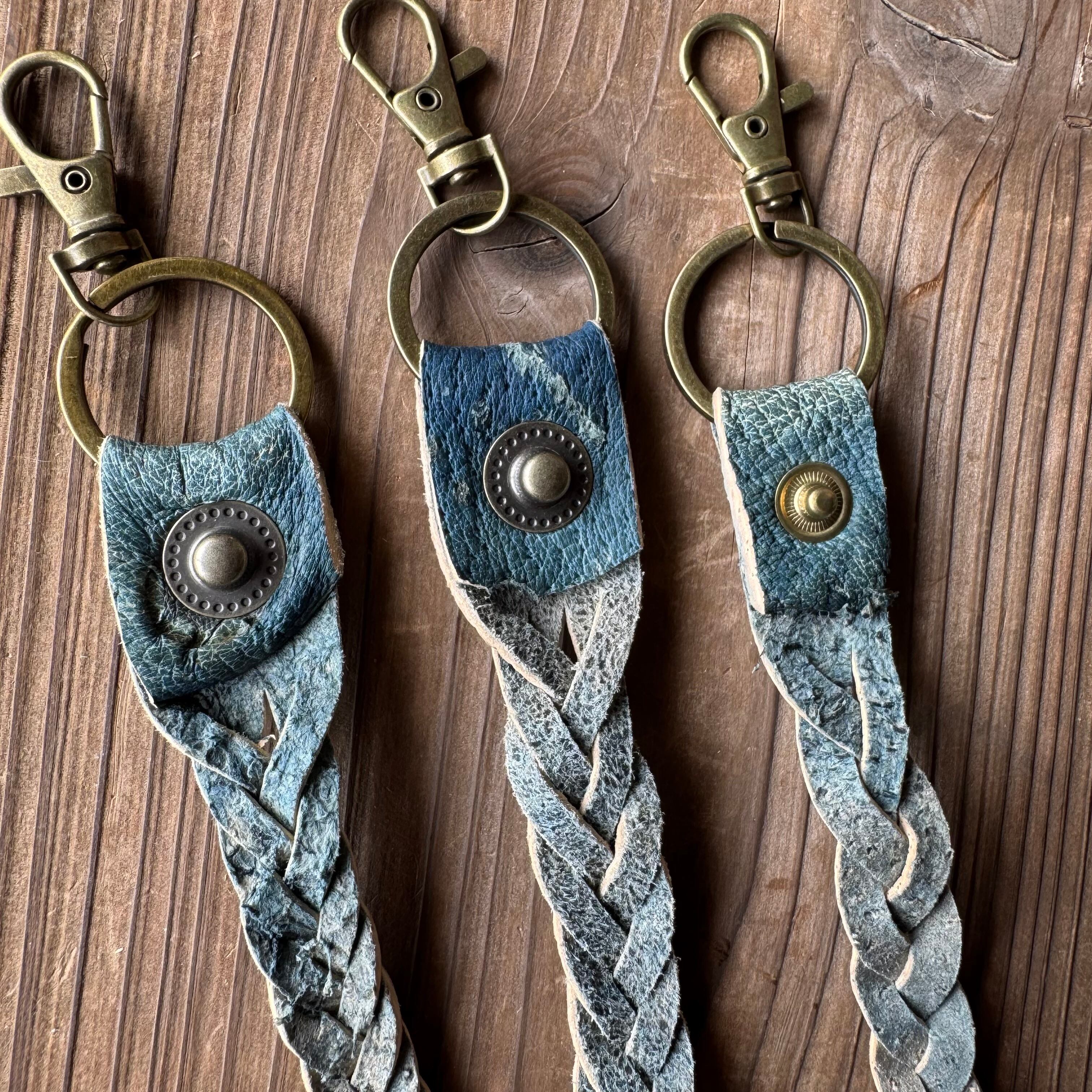 手藍染めのキーホルダー3兄弟(ジビエレザー・イノシシ革) | ジビエレザーHUMMINGBIRD