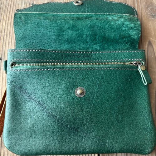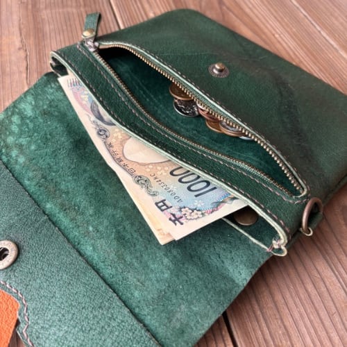 ショルダーストラップで肩掛けできるお財布兼ポーチ。内ポケットはお札入れになり、スマホやその他の荷物とお札を分けられます。